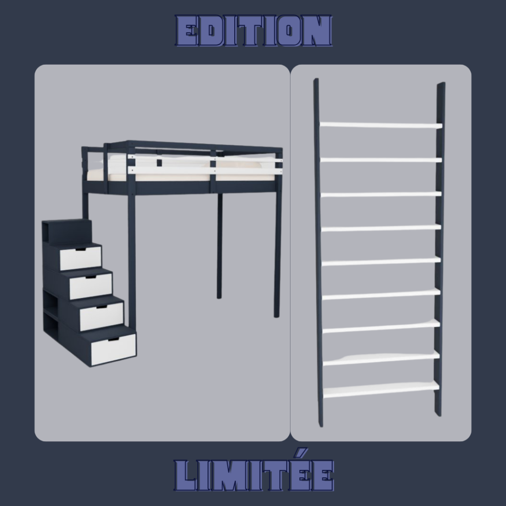 Découvrez notre collection en édition limitée Bleu Astral, une série exclusive qui met à l’honneur deux pièces emblématiques de notre mobilier gain de place : le lit mezzanine avec escalier Brick et l’étagère Manga. Avec leur finition Bleu Astral associée au blanc, ces meubles apportent une touche contemporaine et élégante à la chambre tout en conservant la fonctionnalité qui fait leur succès.