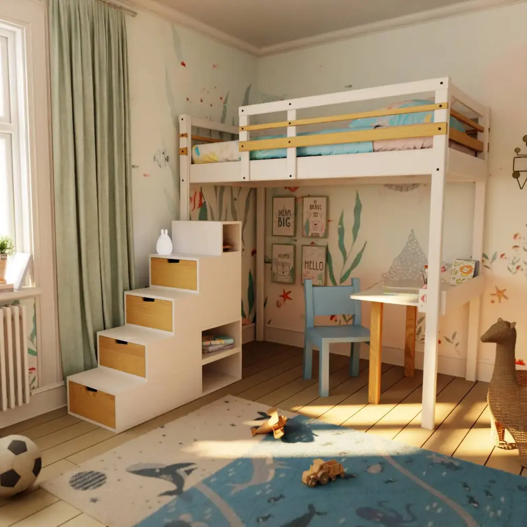 Les différents blocs de rangement — tiroirs, niches ouvertes, compartiments fermés — permettent de stocker facilement livres, vêtements, jeux, accessoires ou objets du quotidien.