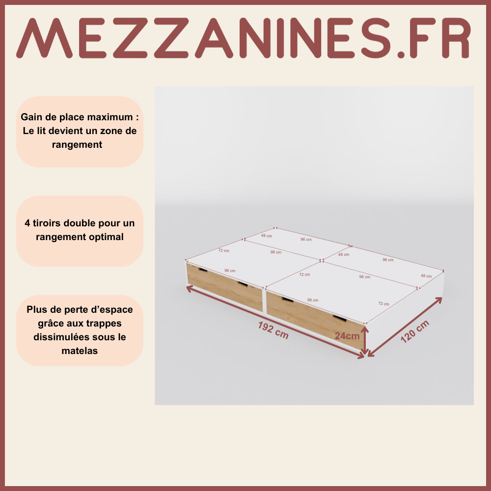 Chacun des blocs qui compose votre lit au sol ajoute du rangement à votre pièce. Prévu pour un couchage en 120×190, vous pouvez l’associer à notre matelas Rubis ou Rueda .