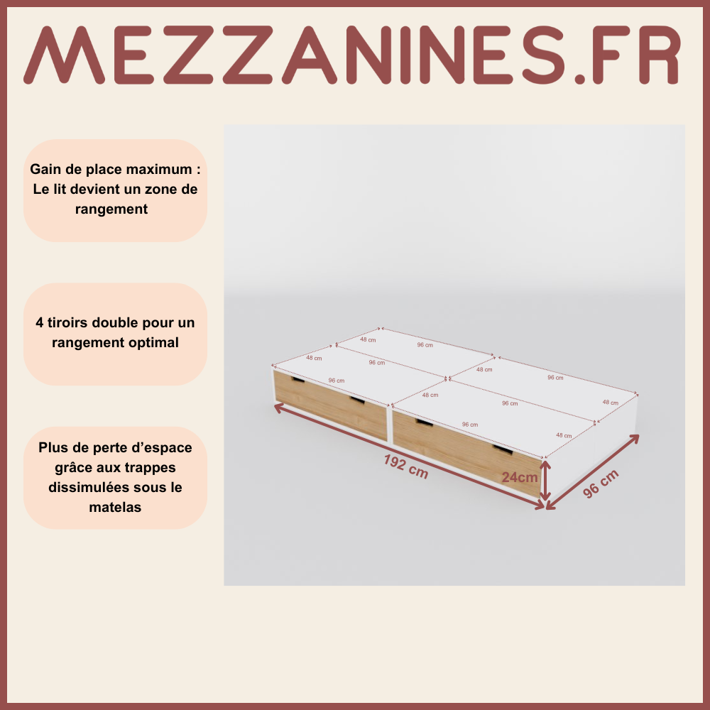 Chacun des blocs qui compose votre lit podium ajoute beaucoup de rangements à votre pièce. Ses grands tiroirs vous permettront d’optimiser votre espace. Vous pourrez créer des espaces de rangements distincts en fonction de vos besoins.